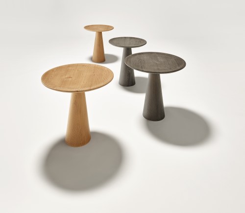 Es sind drei Tischvarianten in unterschiedlichen Höhen erhältlich. Die Tischplatten sind in Glas, Keramik oder Massivholz sowie in unterschiedlichen Maßen und Formen lieferbar. Als Fußvarianten stehen Ihnen eine bombierte oder runde Bodenplatte bzw. der
