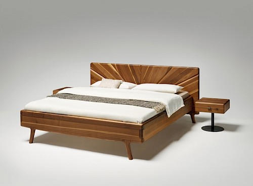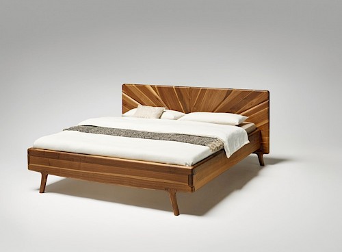 Bett Onira massiv in Eiche, Kernbuche, Zirbe und Nussbaum geölt voll massiv, kpl. metallfrei oder Seitenteile gepolstert.. Seitenteil niedrig und hoch verfügbar. Verschiedene Höhen (Standard und Komforthöhe), verschiedene Kopfteile, sowie gepolsterte Kopfteile möglich