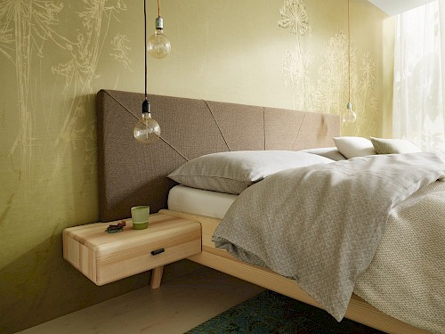 Massivholzbett Big Ann in Zirbe mit gepolstertem Rahmen. Holzarten und Grössen individuell planbar. Natürlich gibt es das Seitenteil ohne Polsterung in massiven Holz. Das Kopfteil gibt es mit 2, 3 oder 4 Pyramidenfräsungen. Bett in verschieden Größen ab 140cm und größer. Breiten: 140/160/180/200, Länge: 200/210/220cm. Holzarten und Grössen individuell planbar. (Asteiche, Eiche, Naturbuche, Buche, Esche, Zirbe, Astnuss, Nussbaum)