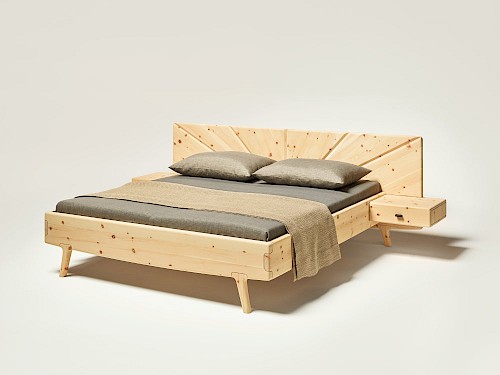 Schlafzimmer Tesso in Zirbe massiv geölt. Massivholzbett in verschieden Größen ab 90cm und größer. Vom Einzelbett, Doppelbett bis zum Familienbett mit 270x200cm ist alles möglich. Massivholz Kleiderschrank individuell in fast jeder Größe machbar. Holzarten und Grössen individuell planbar. (Asteiche, Naturbuche, Esche, Zirbe, verschiedene Lackfarben und Farbgläser)