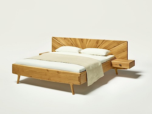 Massivholzbett Onira in Eiche, Kernbuche, Zirbe und Nussbaum geölt voll massiv, kpl. metallfrei. Seitenteil niedrig und hoch verfügbar. Verschiedene Höhen (Standard und Komforthöhe), gerades oder schräges Kopfteil, sowie gepolsterte Kopfteile möglich.
