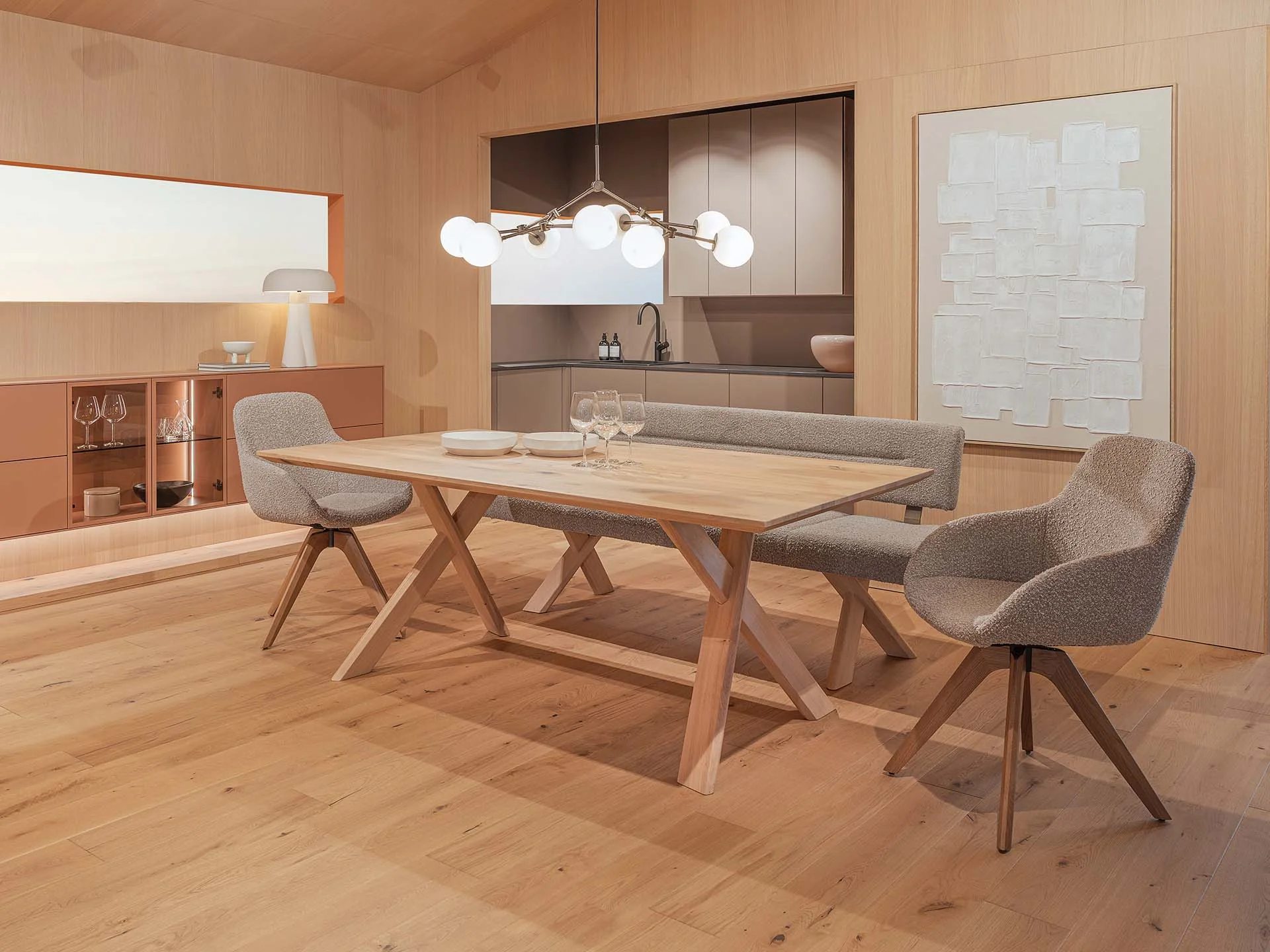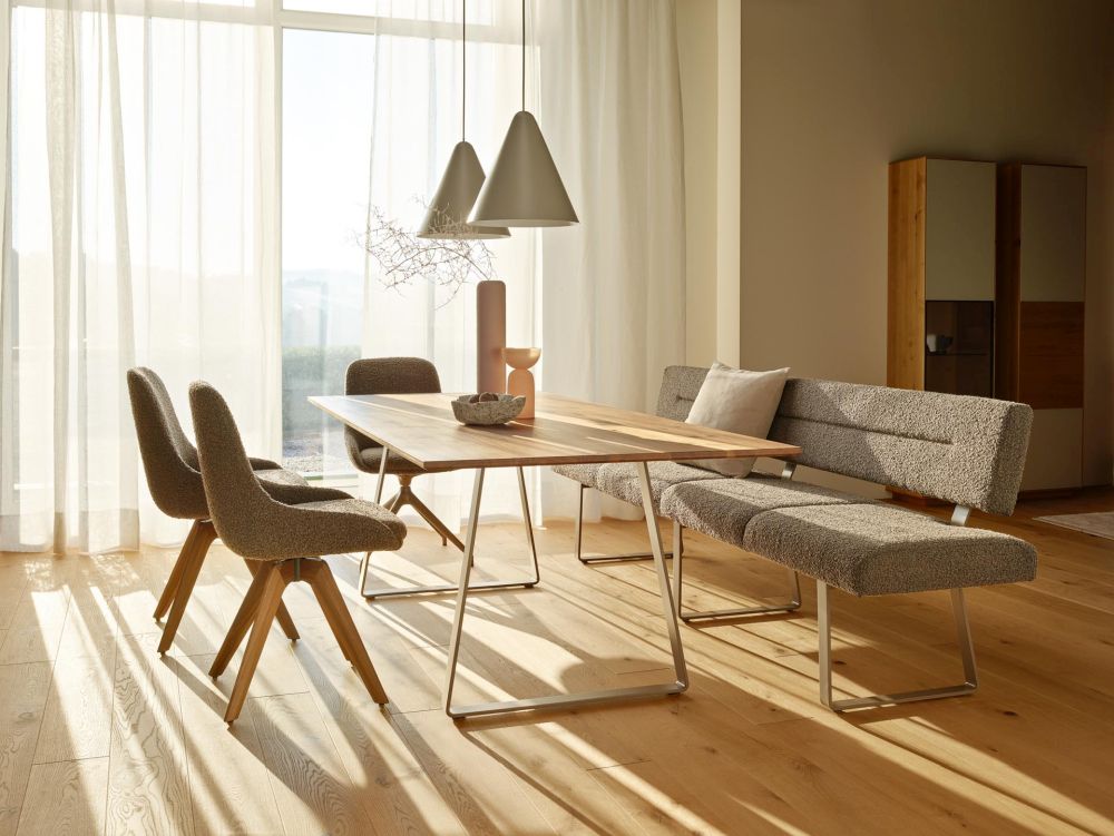 Beim Tisch der Serie gino sind die Beine mittels Steg verbunden, was Design mit Stabilität vereint. Der Tisch kommt nicht allein. Ihm zur Seite stehen Sessel und Bank. Die für den Tisch gewählte Holzart setzt sich bei der Sitzgelegenheit formschön fort. Die Bank gibt es in 2 Ausführung, mit offenen oder geschlossenen Rücken, verschiedene Holzarten, Stoffe und Leder, sowie individuelle Breite.