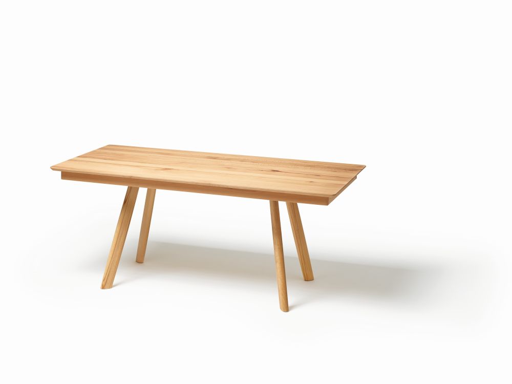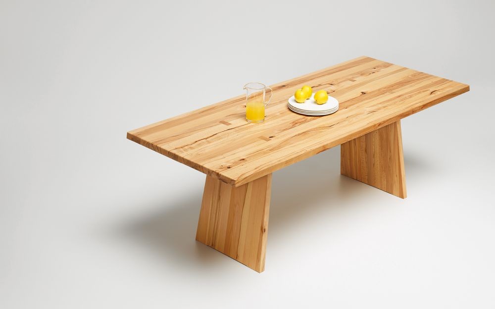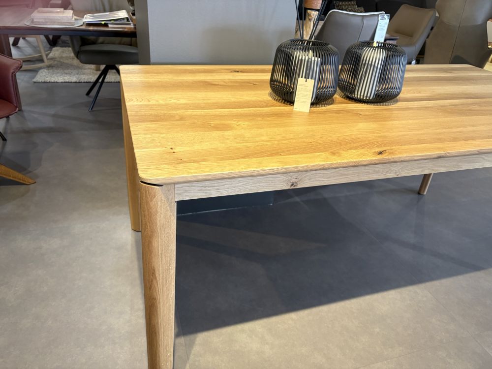 Massivholztisch mit besonderen Untergestell.Holzarten und Grössen (160-240cm) indivduell wählbar. Optional externe Ansteckplatten und unterschiedliche Kantenformen.