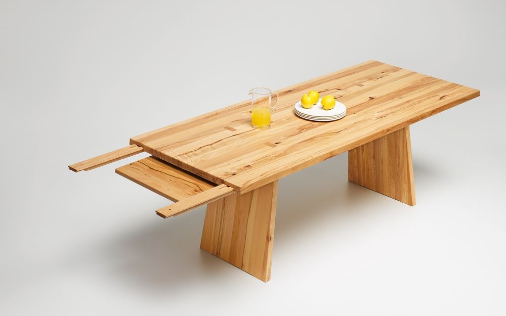 4-Fuß Tisch in Asteiche, Kernbuche oder Nussbaum massiv. Unser Raumwunder auch für sehr kleine Tische mit integrierten Auszugsplatten. Optional mit Auszug in folgenden Größen: 45 cm, 60 cm, 70 cm, 100 cm, 2×40 cm a 2×49 cm. Bereits ab 90x80cm Tischgröße kann bereits eine einzelne Auszugplatte mit 45cm eingebaut werden. Individuelle Grössen und Holzarten möglich.