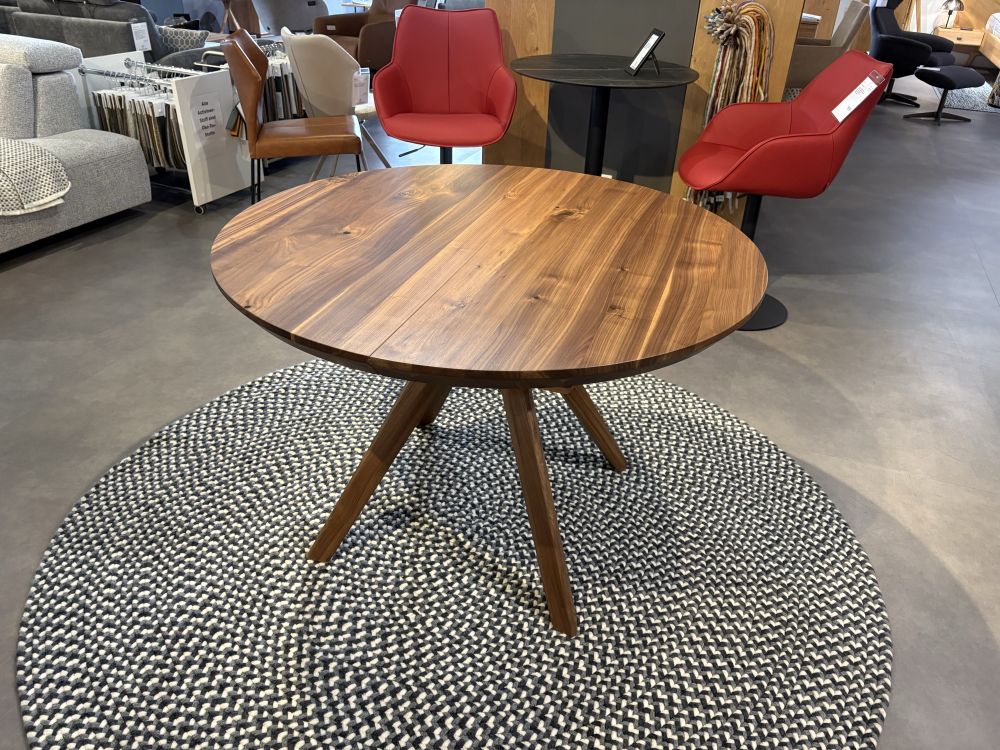 Unser runder Tisch listo. Auf Wunsch mit Syncronauszugssystem. Verschiedene Holzarten und Größen möglich.