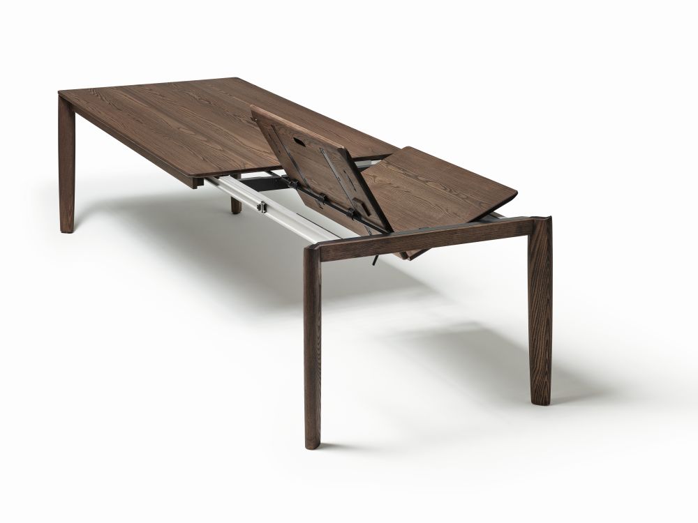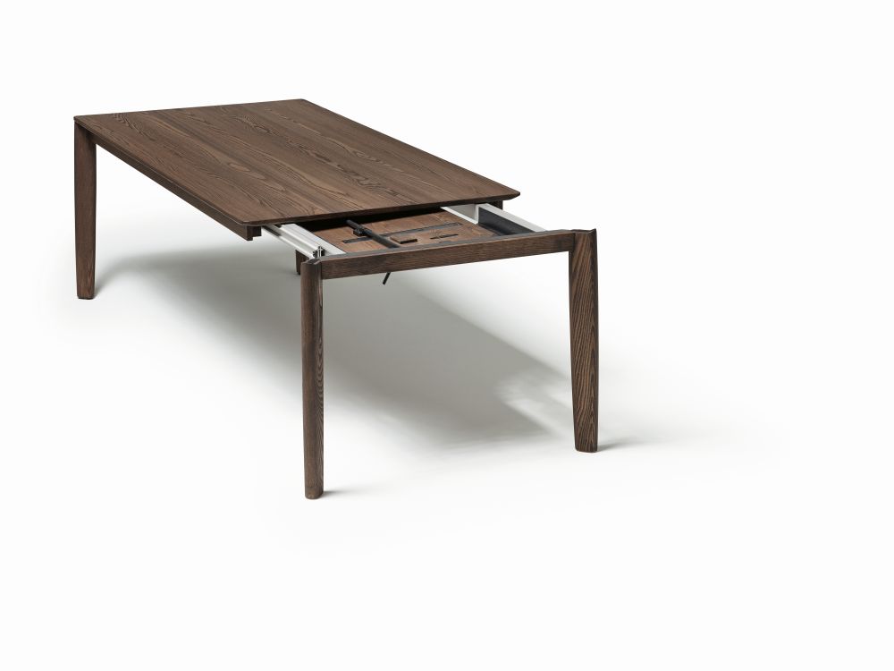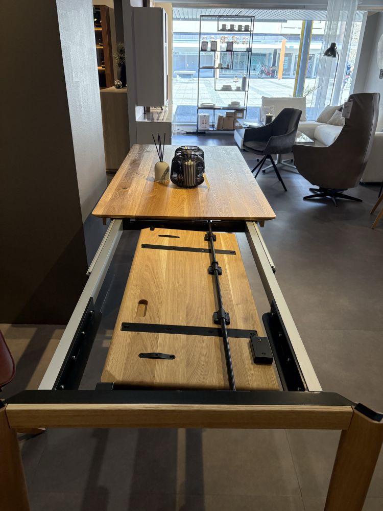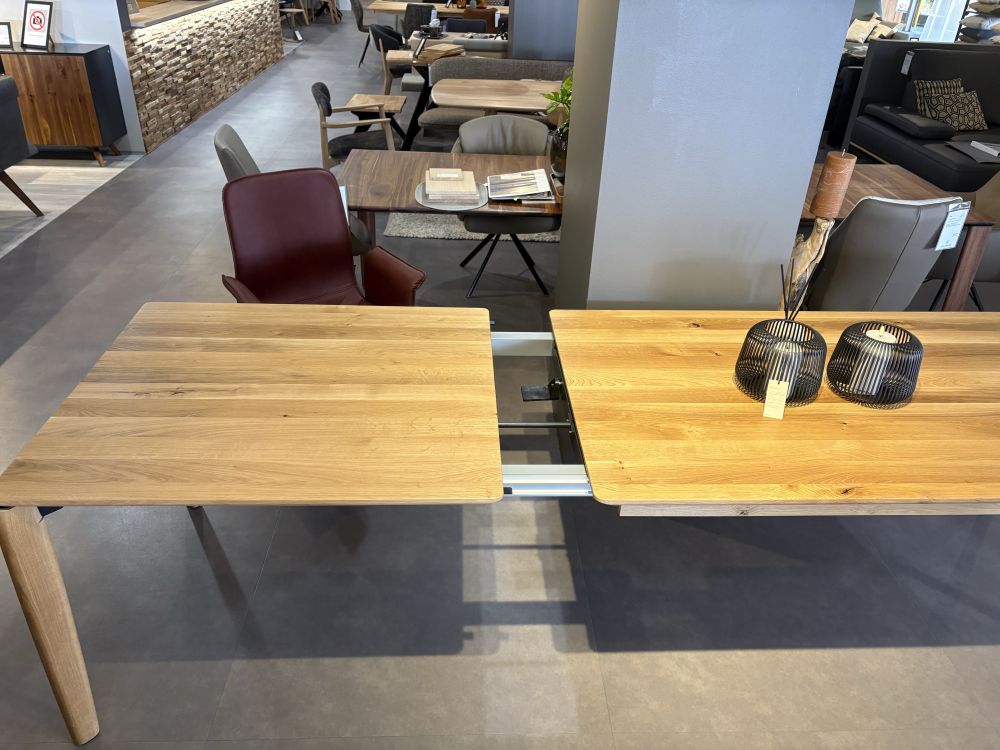 Dieser Tisch ist schneller ausgezogen, als die Überraschungsgäste aus den Mäntel schlüpfen können. Die Konstruktion erhöht die Stabilität, sieht gut aus und ist eine unglaublich angenehme Fußstütze noch dazu. Zusätzlich gibt es das Tischsystem sowohl mit innenliegenden Füssen mit und ohne Fussstütze, sowie aussenliegenden Füssen. Wenn die Fussstütze stört, es geht auch ohne.