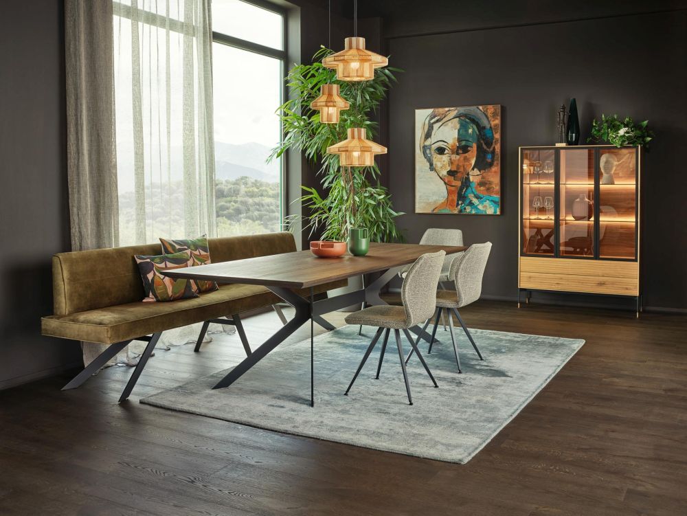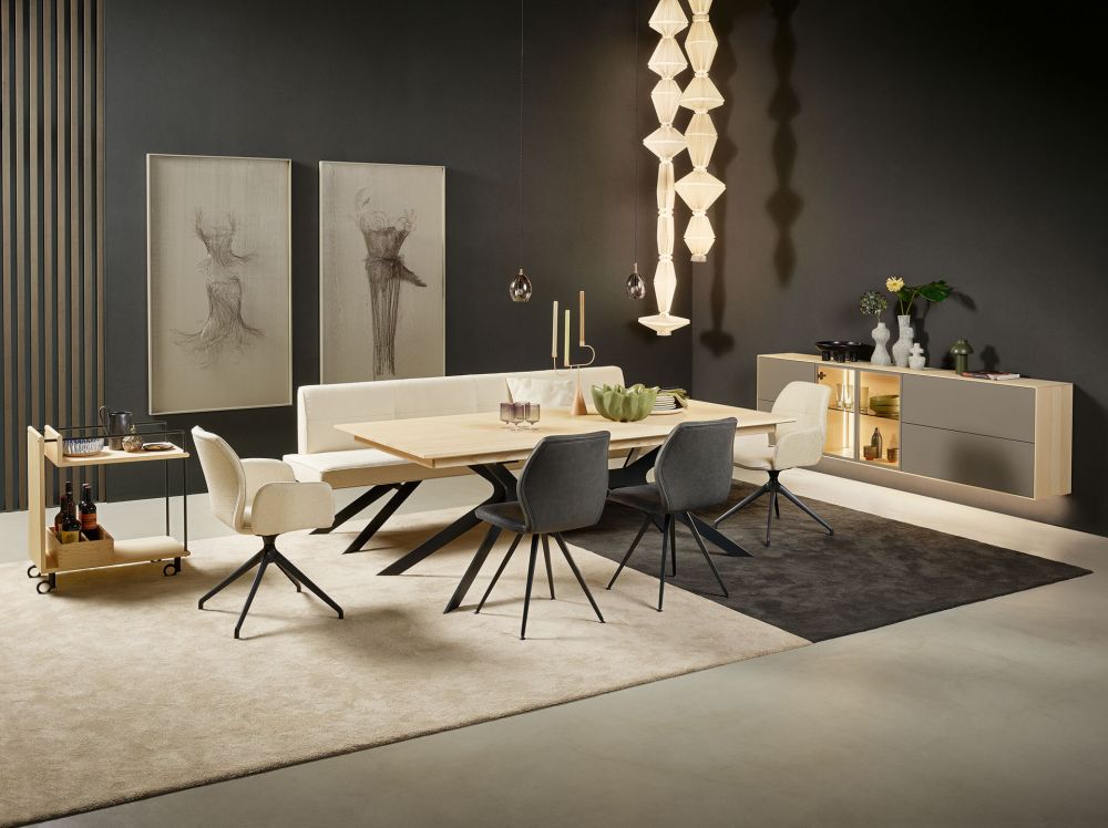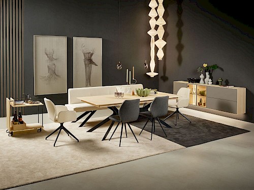 Das Speisezimmerprogramm von Anrei besticht durch formschöne Details, die von der Natur inspiriert sind. Aufgrund der Vielfalt der Formen und Ausführungen kann man sich sein Esszimmer ganz nach seinen Vorstellungen zusammenstellen. Eine große Auswahl an Hölzern, Stoffen, Polster- und Gestellvarianten (Holz und Metallgestelle) machen dieses Möbelprogramm zu einem wunderbar „wandelbaren“ Ensemble, das keine Wohnwünsche offen lässt. Tische als Fixtische oder mit 3 Auszugsvarianten (integrierte Ansteckplatte, Swingauszug, Syncronauszug).Holzarten und Grössen individuell planbar.