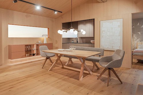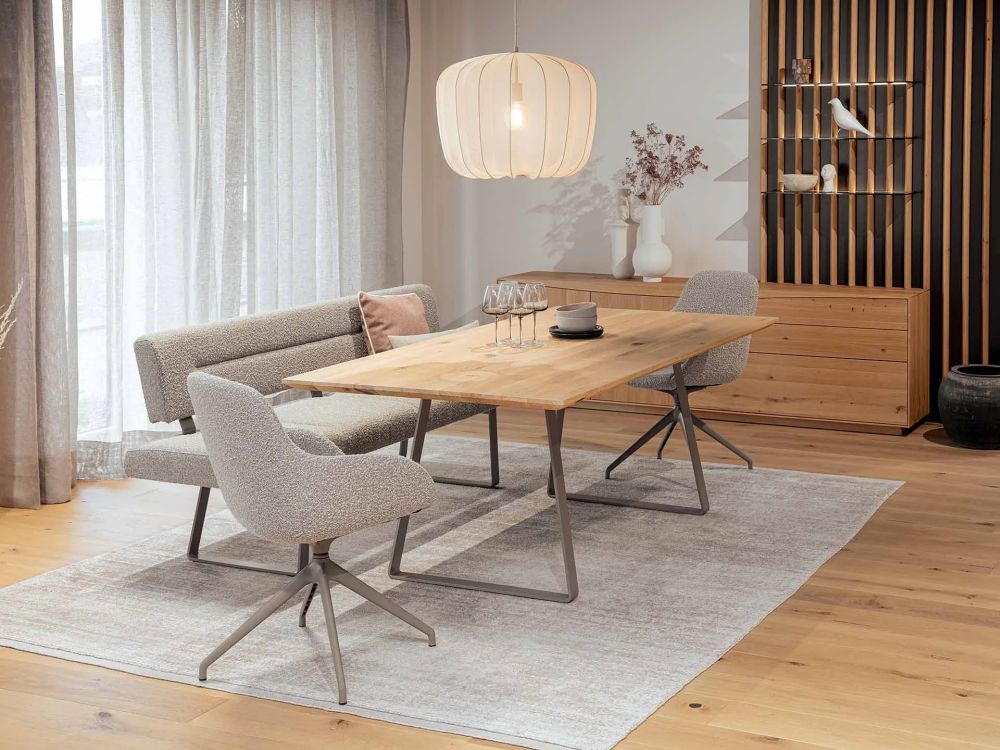 Eine große Auswahl an Hölzern, Stoffen, Polster- und Gestellvarianten (Holz und Metallgestelle) machen dieses Möbelprogramm zu einem wunderbar „wandelbaren“ Ensemble, das keine Wohnwünsche offen lässt. Tische als Fixtische oder mit 3 Auszugsvarianten (integrierte Ansteckplatte, Syncronauszug, Gestellauszug).Holzarten und Grössen individuell planbar. Metallgestelle in anthraziet, reinweiß, lichtgrau, sand, mocha mousse, steingrau, seide, zartbitter, schwarzgrau