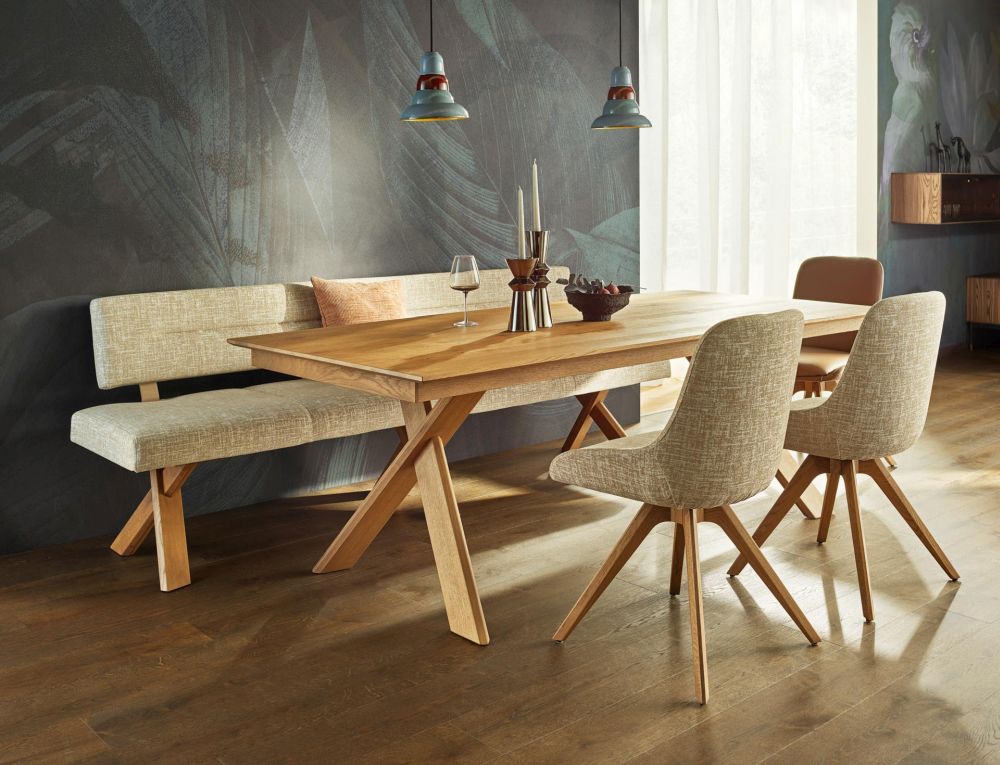 Tisch Vivo mit Bank und Stühlen in Asteiche geölt. Tisch als Fixtisch oder Auszugstisch (integrierte Ansteckplatte, Swingauszug oder Syncronauszug) mit Holz oder Metalluntergestell, Holzarten und Grössen individuell planbar.