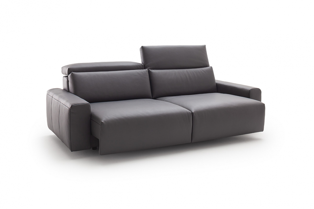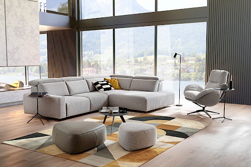 Sofa mit optionaler elektrischer Relaxfunktion mit Herz-Waage-Funktion oder Sitzvorzug. Vielfältiger Typenplan für individuelle Anpassung. 2 Höhen (45 +48cm), 3 Härten 4 Armlehnen. Sitztiefe 52cm, 4 Sitzbreiten (60-70-80-90). Holzfüsse, Metallfüsse. Manueller Sitzvorzug (Sitztiefe 52-60cm variabel). Über 300 Stoffe und Leder.