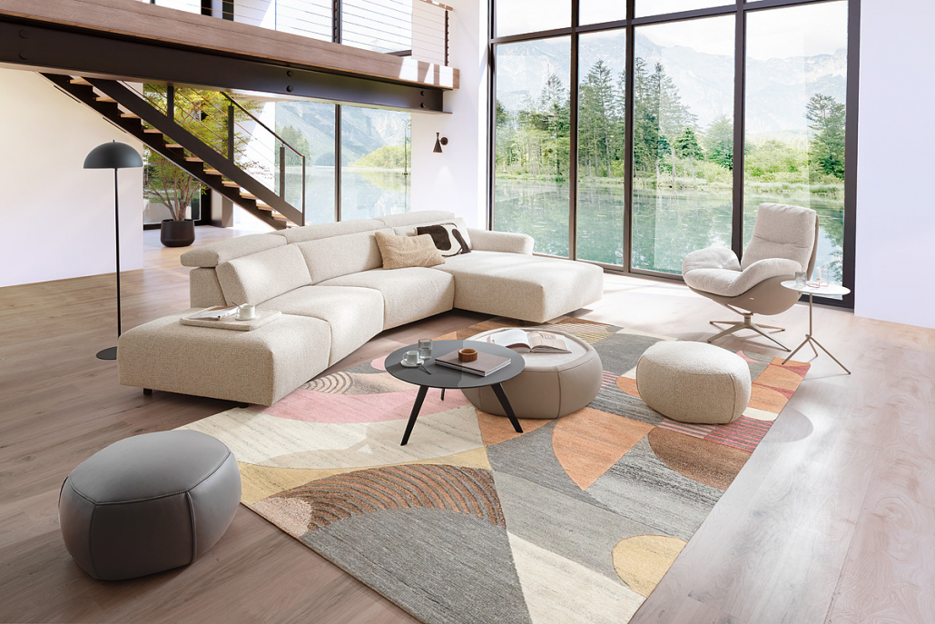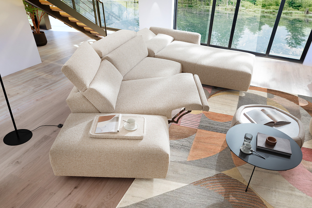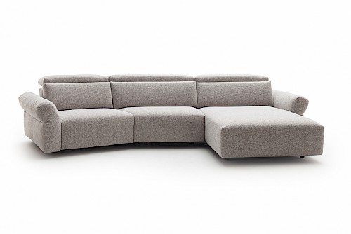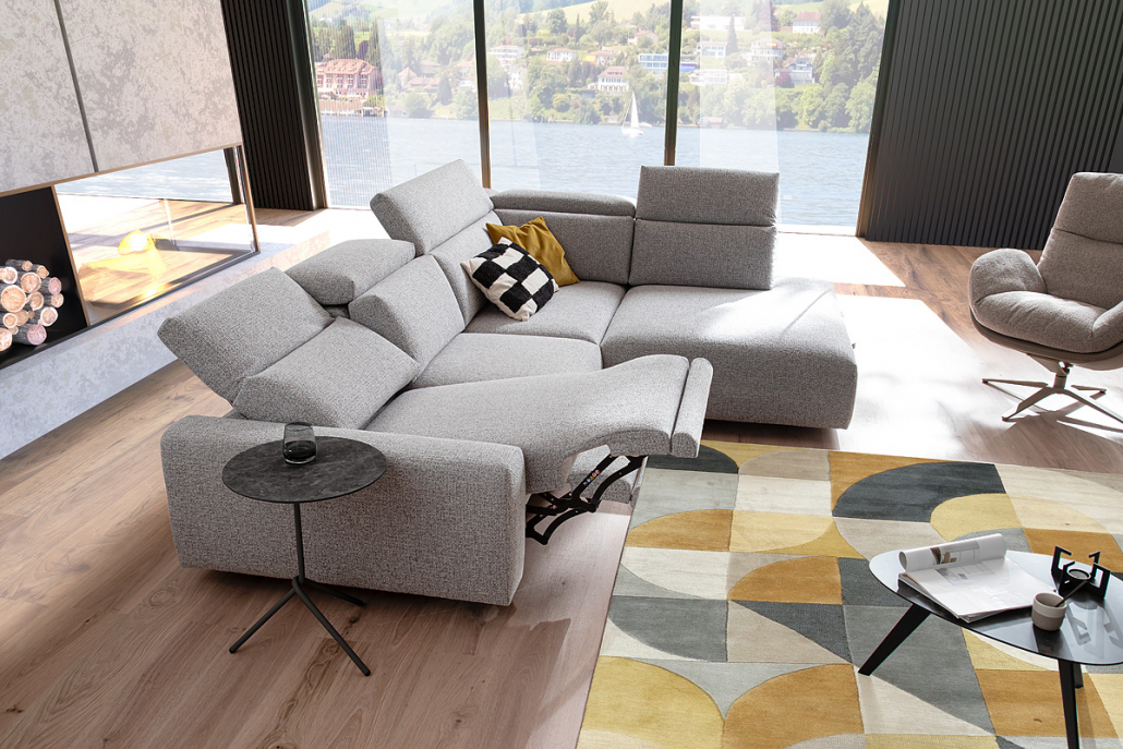 Model Giovanna. Umfangreicher Typenplan für individuelle Anpassung, 4 Armlehnvarianten, 3 Sitzhärten, Mtallfüsse, Metallkufen, Holzfüsse, 5-Sitzbreiten, optional motorische Relaxfunktion. Superbequeme, moderne Couch mit Relaxfunktion für noch mehr Komfort. Im Handumdrehen lassen sich der Longchair und der 1,75-Sitzer durch die integrierte motorische Funktion bequem in eine Liegeoase verwandeln.
