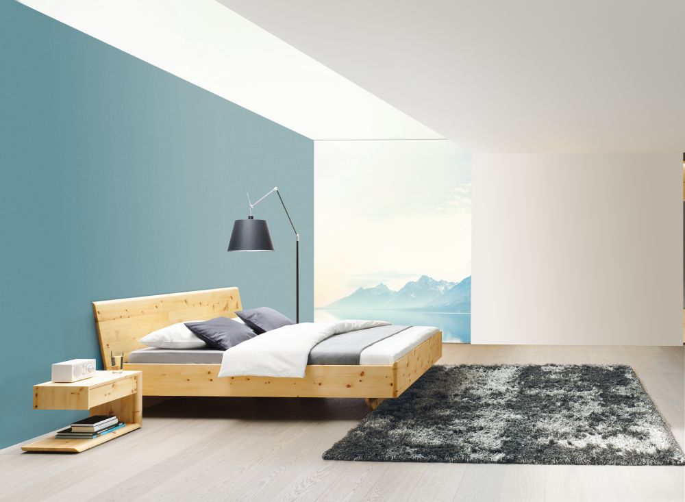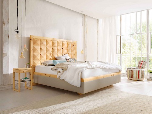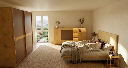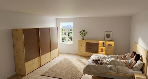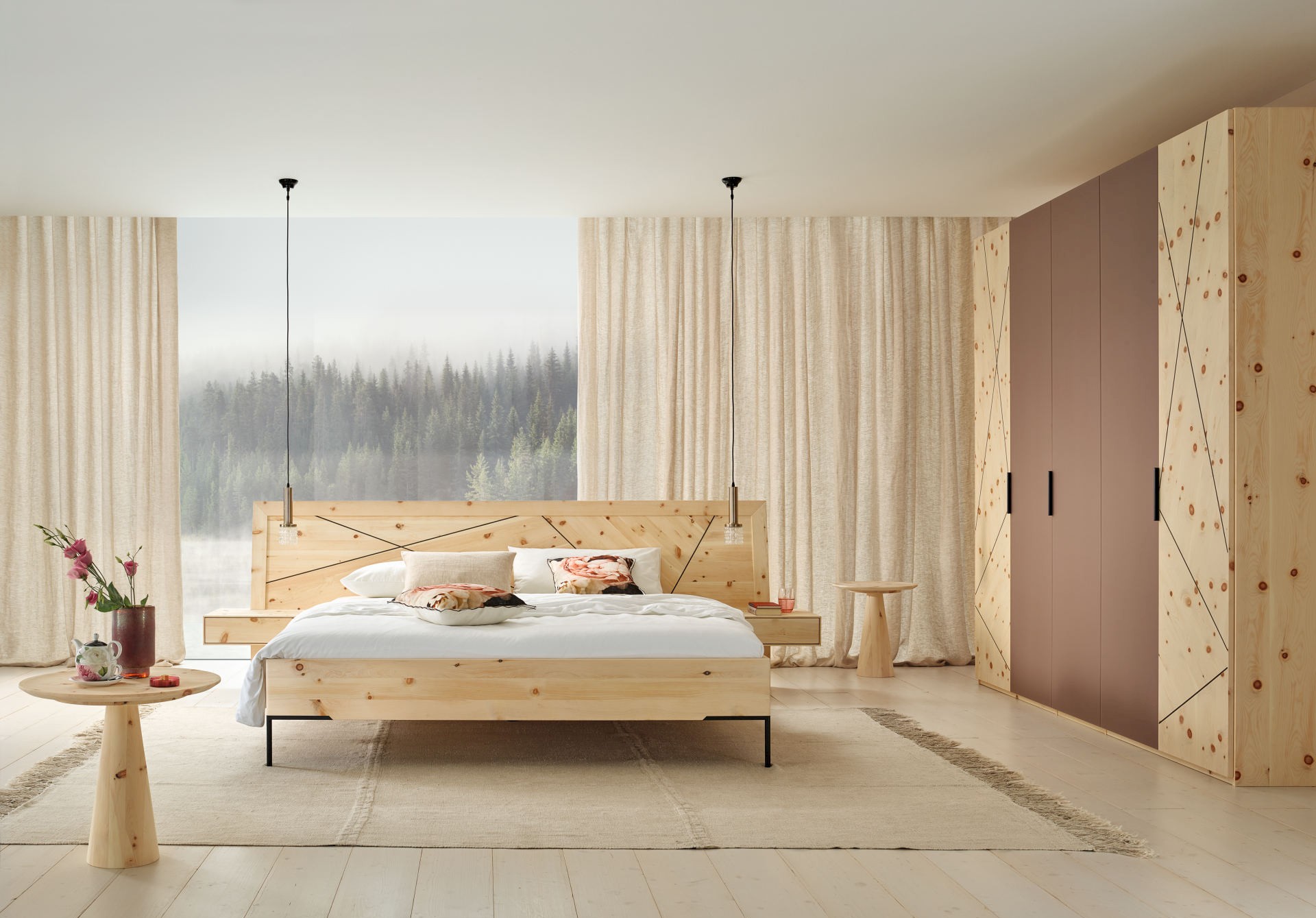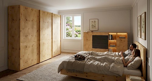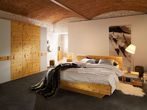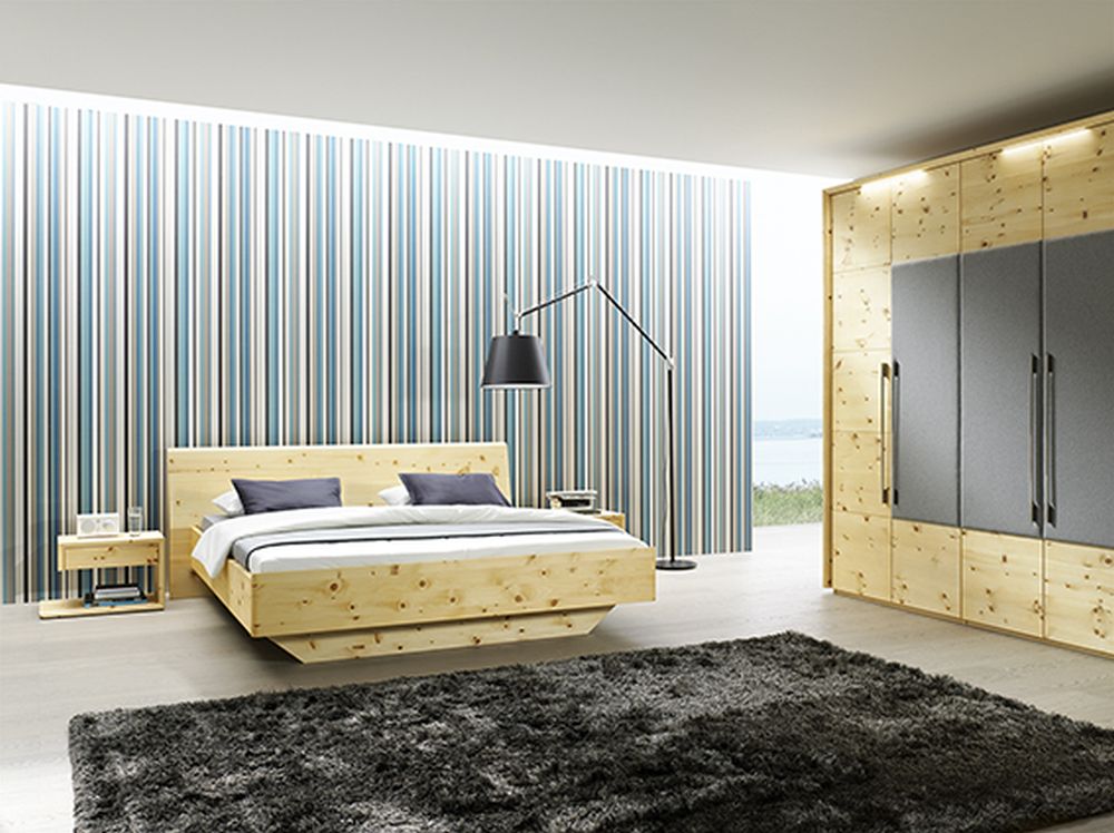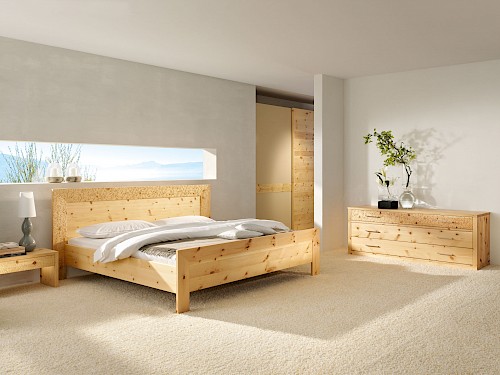 Schlafzimmer Paso in Zirbe natur massiv geölt. Bett massiv in verschieden Größen ab 140cm und größer. Holzarten und Grössen individuell planbar. (Asteiche, Naturbuche, Esche, Zirbe, verschiedene Lackfarben und Farbgläser)