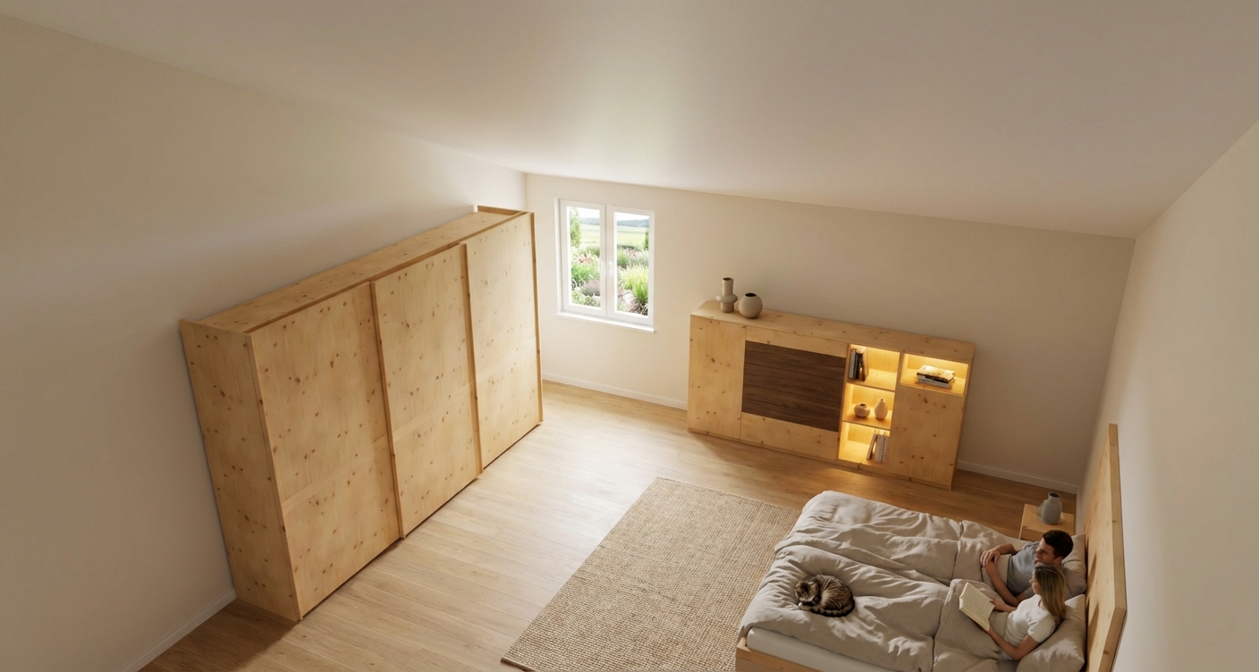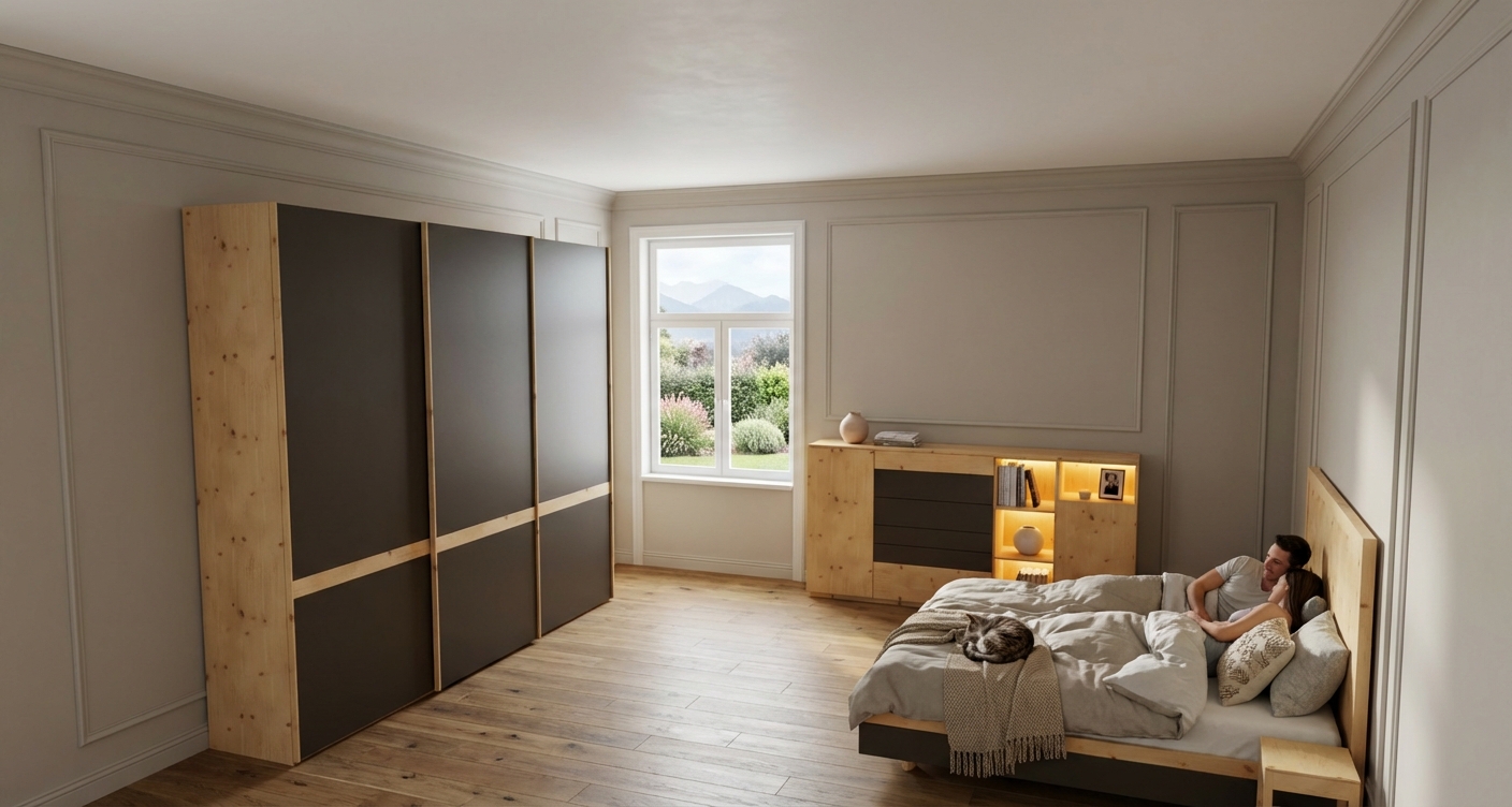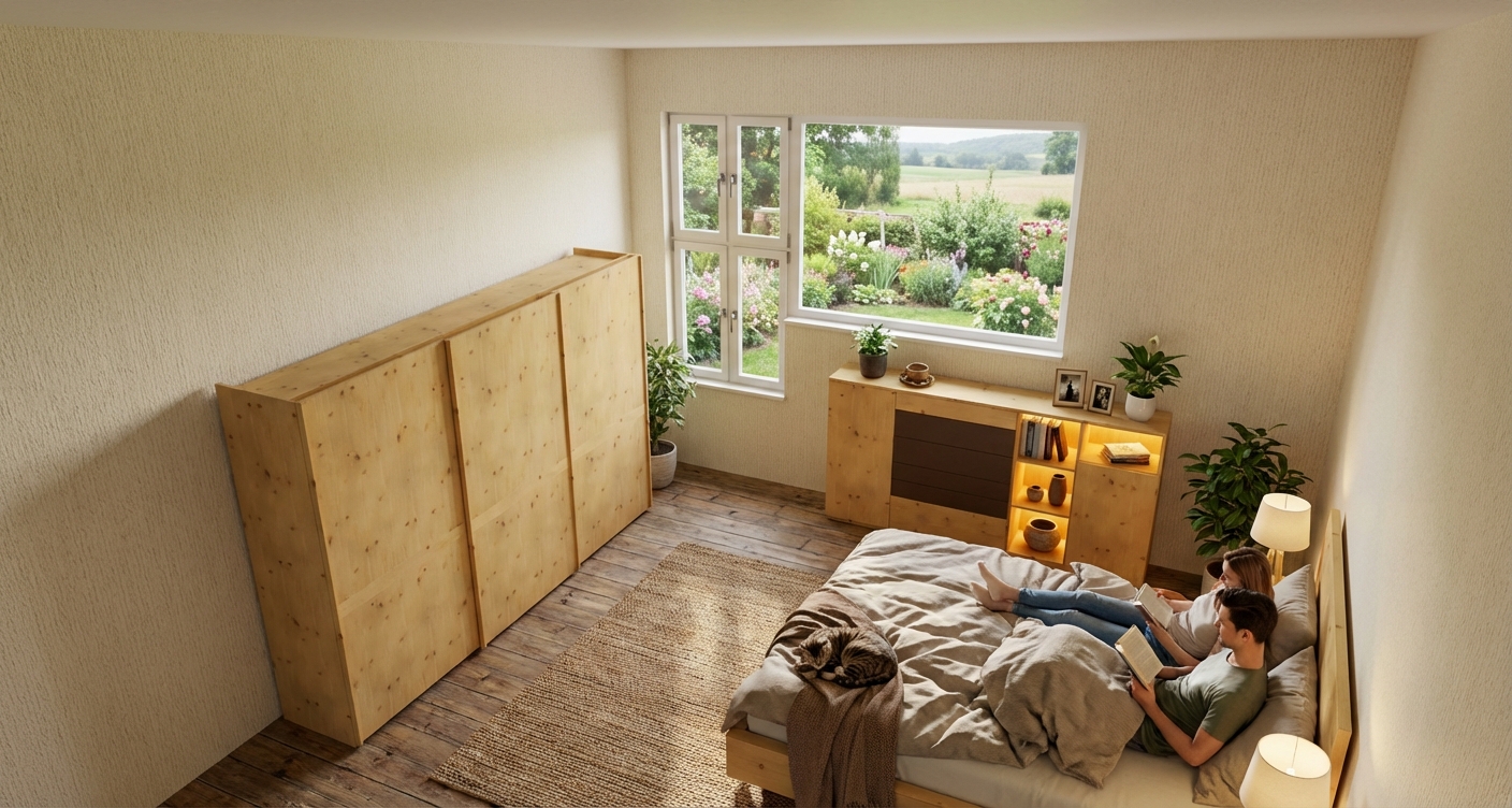 Schlafzimmer Paso in Zirbe natur massiv geölt. Bett massiv in verschieden Größen ab 140cm und größer. Holzarten und Grössen individuell planbar. (Asteiche, Naturbuche, Esche, Zirbe, verschiedene Lackfarben und Farbgläser)
