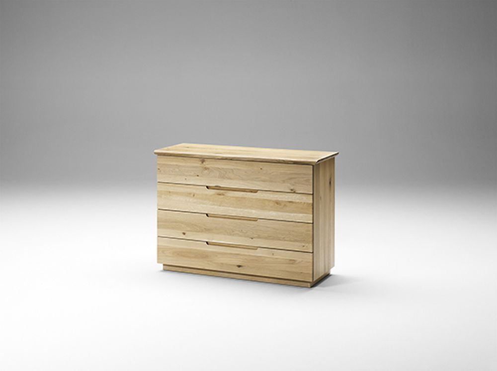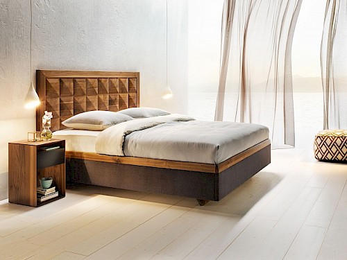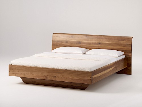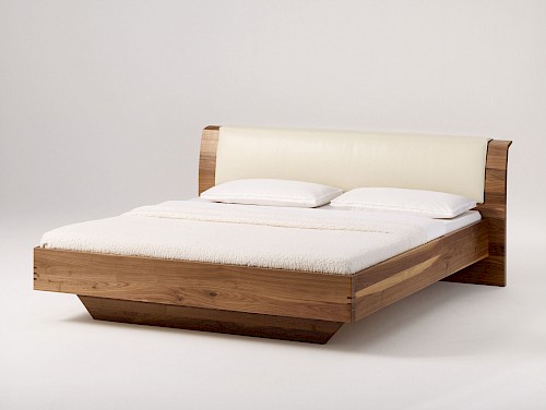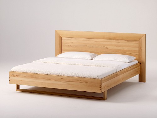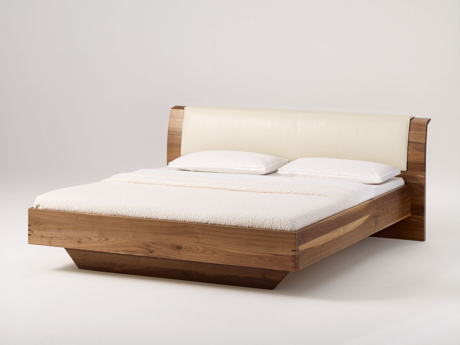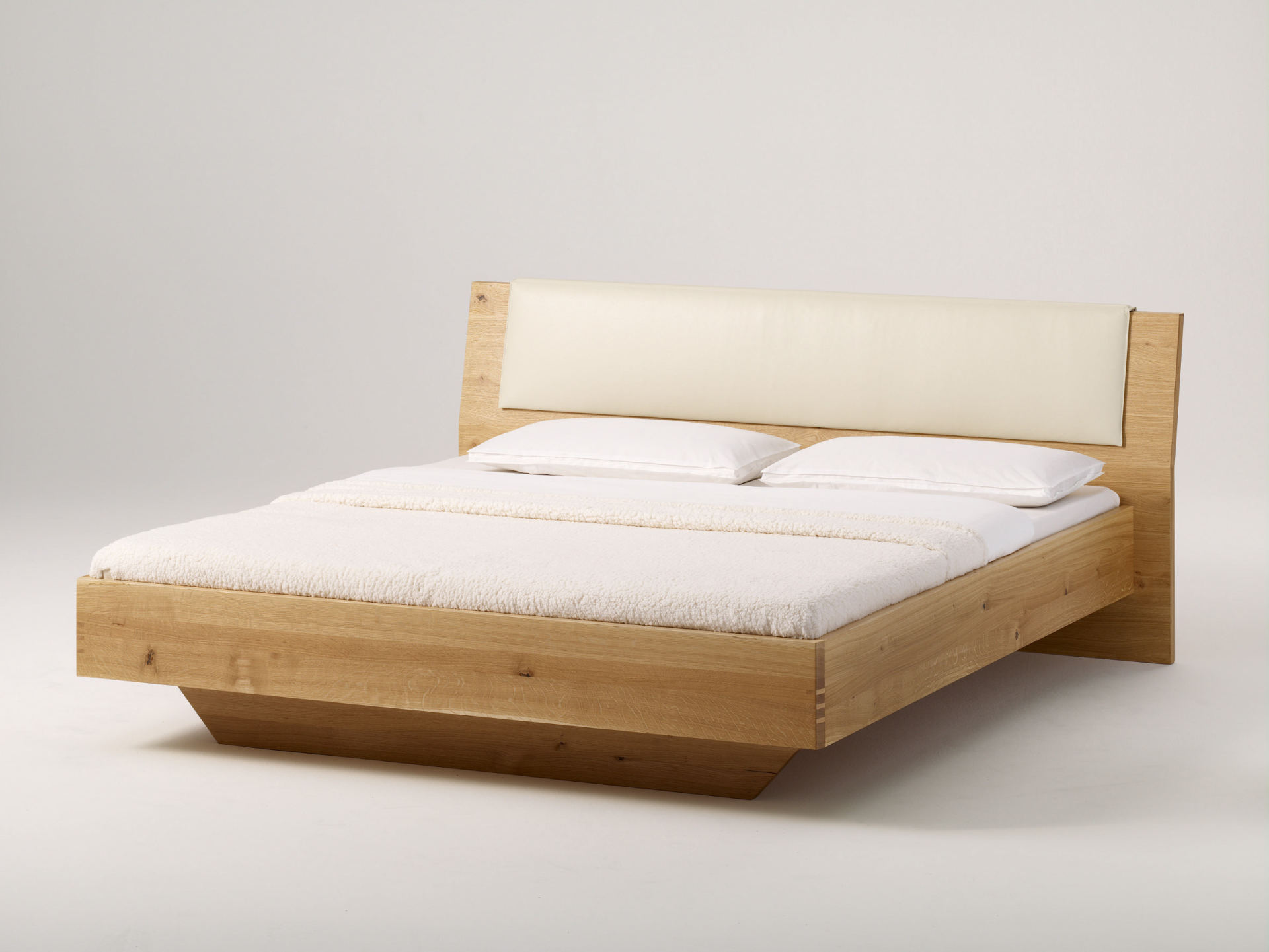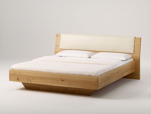 Bett Onira massiv in Eiche, Kernbuche, Zirbe und Nussbaum geölt voll massiv, kpl. metallfrei oder Seitenteile gepolstert.. Seitenteil niedrig und hoch verfügbar. Verschiedene Höhen (Standard und Komforthöhe), verschiedene Kopfteile, sowie gepolsterte Kopfteile möglich