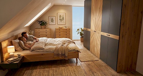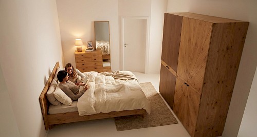 Lassen Sie mit unserem stilvoll eleganten Massivholzbett „Swing“ Ihre Alltagssorgen hinter sich und schalten Sie vollkommen ab.