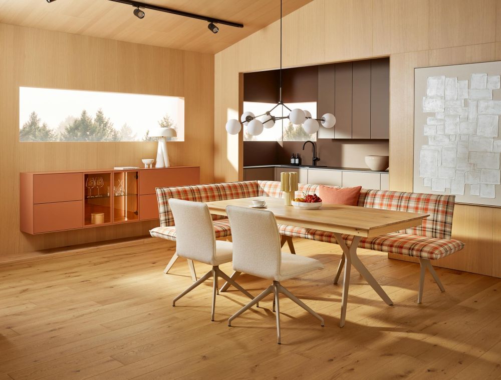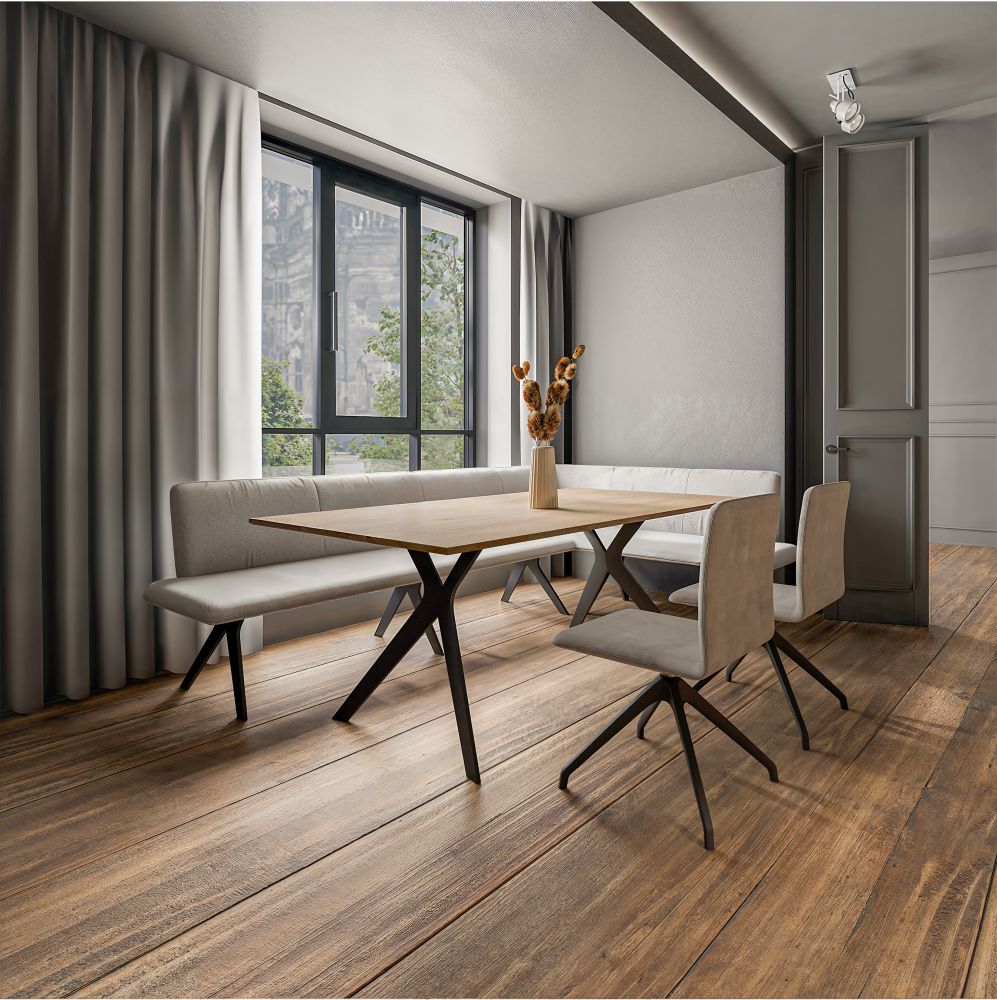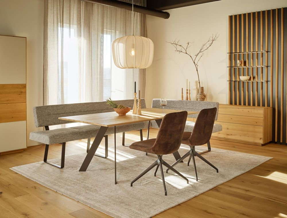 Beim Tisch der Serie gino sind die Beine mittels Steg verbunden, was Design mit Stabilität vereint. Der Tisch kommt nicht allein. Ihm zur Seite stehen Sessel und Bank. Die für den Tisch gewählte Holzart setzt sich bei der Sitzgelegenheit formschön fort. Die Bank gibt es in 2 Ausführung, mit offenen oder geschlossenen Rücken, verschiedene Holzarten, Stoffe und Leder, sowie individuelle Breite.