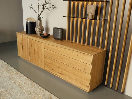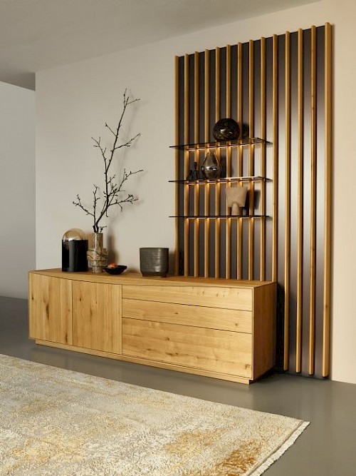 Ein schönes Massivholzprogramm in Wildeiche mit 2 verschiedenen Lackfronten. Lowboard, Sideboards, Highboard, Vitrinen, hier gibt es eine große Auswahl. Made in Germany! Für individuelle Sonderanfertigung bei unserem Programm Puro, Lina oder Ruum schauen.