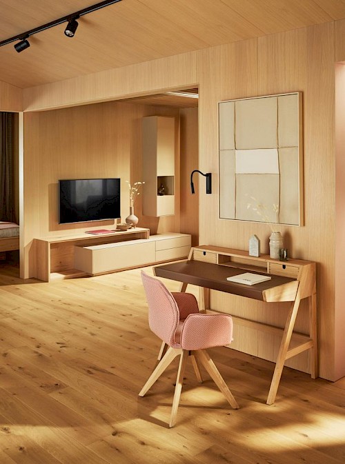 Zu sehen sind klare Formen mit ausdrucksstarken Fronten: nicht zufällig klingt puro wie pur. Was man nicht sieht, ist alles, das sich auf Wunsch hinter den Türen in Massivholz pur, lackiert oder mit Farbglas verbirgt. Da werden Kabel gemanagt und Türen mit Akustikstoff Klang durchlässig bespannt. puro meistert alle Lebenslagen und die damit verbundenen Ansprüche.